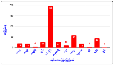 တိုင်းဒေသကြီးနှင့်ပြည်နယ်အလိုက် လေကြောင်းတိုက်ခိုက်မှု ကြုံတွေ့ရသော မြို့နယ်အရေအတွက်